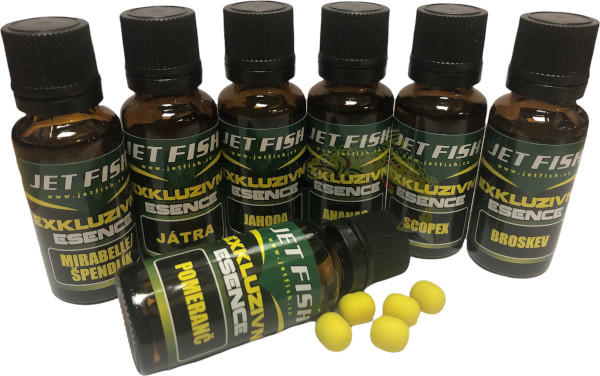 Esence JET FISH jsou velmi koncentrované příchutě, z nichž některé jsou sestaveny na různých základech a obsahují např.glycerol, propylen glykol, ethylalkohol a esenciální oleje.