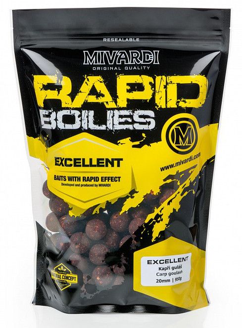 Boilies Mivardi Rapid Excellent Kapří guláš je univerzálně použitelná řada boilies s rychlejším nástupem. Kořeněná i rybí varianta.