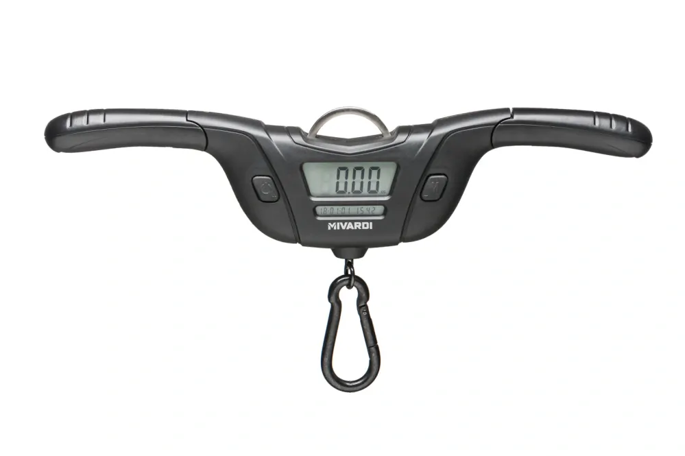Luxusní digitální váha MIVARDI MC50 s masivními sklápěcími rukojeťmi, pevnostním závěsným okem a kvalitní karabinou pro zavěšení vážícího saku.