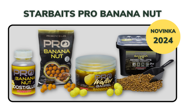 Jednou z těchto novinek jsou produkty ze série ProBanana Nut, do níž patří hned několik produktů. Prvním z těchto produktů jsou Boilies Pro Banana Nut o průměru 24 mm, dále pak Boilies Pro Banana Nut s průměrem 20 mm, Plovoucí boilies Pop Up Probiotic Banana Nut (mající průměr 16 mm) nebo Dip Pro Banana Nut pro zintenzivnění vůně boilies v lahvičce s obsahem 200 ml. Také v naší nabídce naleznete Pelety Mixed Pro Banana Nut v balení o obsahu 2 kg a jako poslední z této řady pak háčkovou nástrahu Wafter Pro Banana Nut, která má průměr 14 mm.