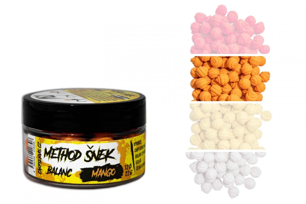 Method Šnek Feeder Balanc přináší nejen klasické přednosti balanc nástrah, ale má i schopnost velmi intenzivního uvolňování atraktorů a částečnou rozpustnost. Dalším atributem je inovativní tvar, který imituje přirozenou potravu - různé druhy plžů, což je činí neodolatelnými pro většinu, i těch nejopatrnějších kaprovitých ryb.